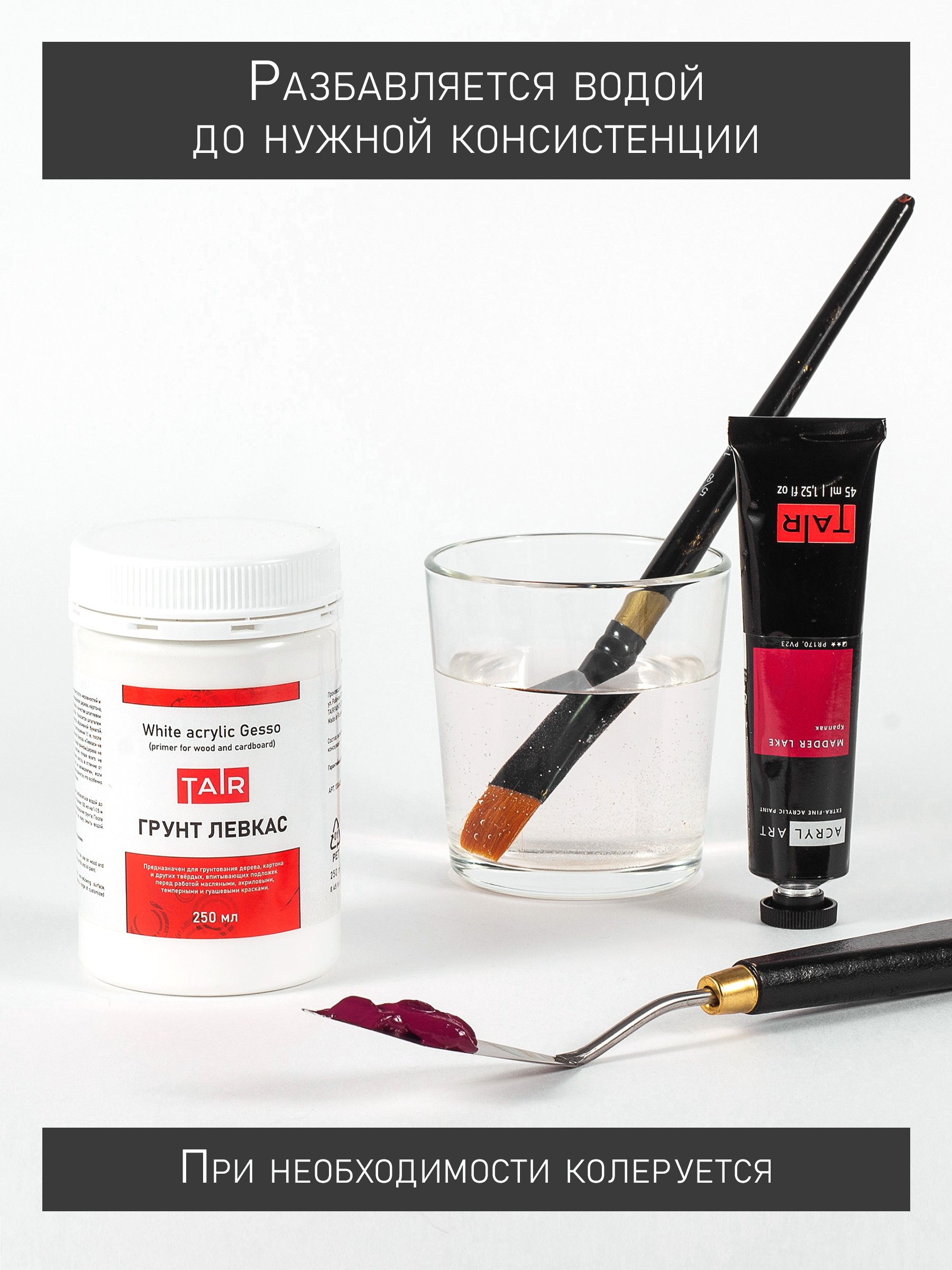 Используют не только для акриловых, но и для масляных, темперных, гуашевых и других красок, а также как основу для золочения поталью и сусальным золотом.
