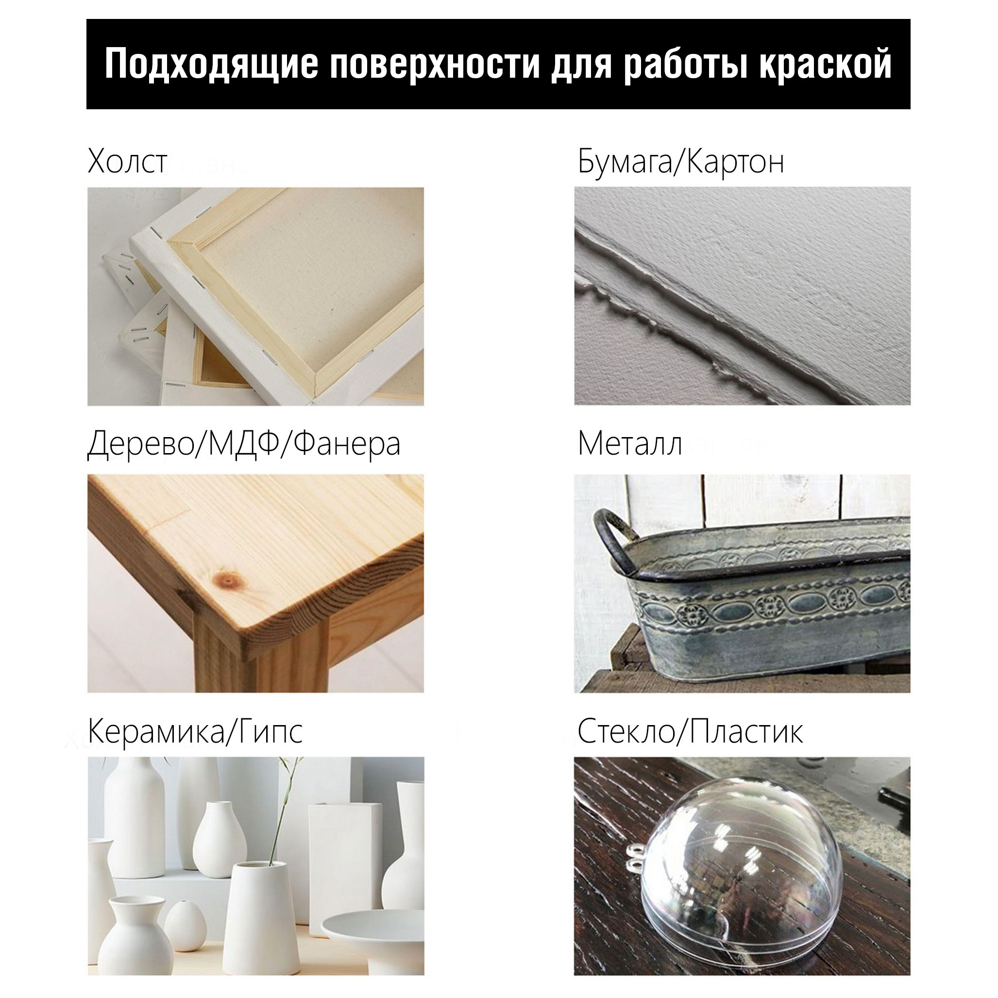 Подходящие поверхности: краски прекрасно ложатся на различные материалы: холст, грунтованный картон, дерево, все виды камня, гипсовые поверхности, бетон и кирпич, штукатурку, стекло, ткань, некоторые пластмассы и металл, покрытый грунтом.
