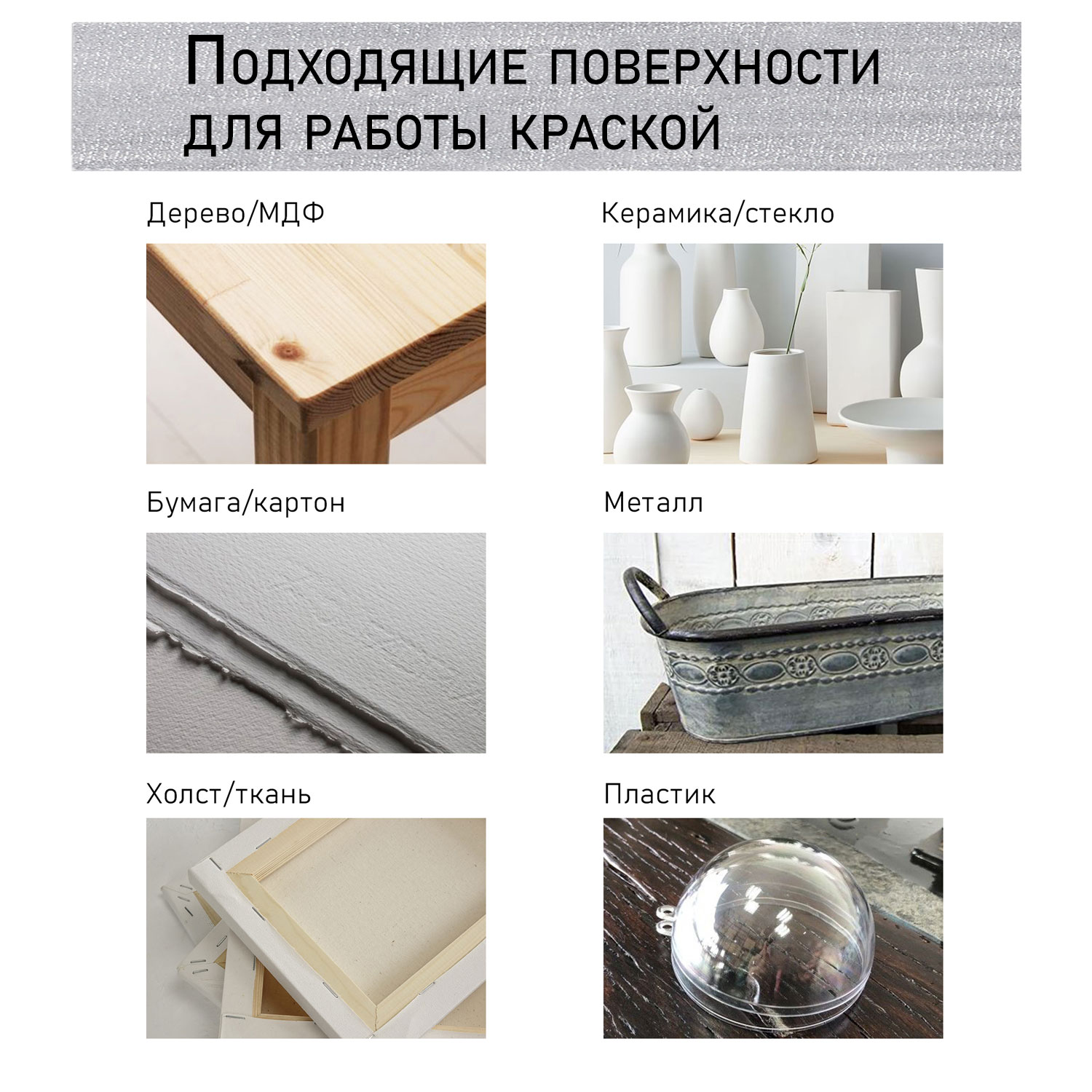 Подходящие поверхности: дерево, фанера, бумага, картон, грунтованный холст, ткани, стекло, грунтованный металл, бетон, кирпич, гипс, природный камень, штукатурка и др.