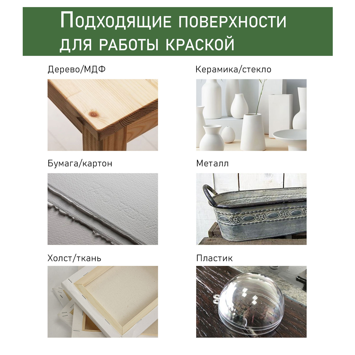 Подходящие поверхности: дерево, фанера, бумага, картон, грунтованный холст, ткани, стекло, грунтованный металл, бетон, кирпич, гипс, природный камень, штукатурка и др.