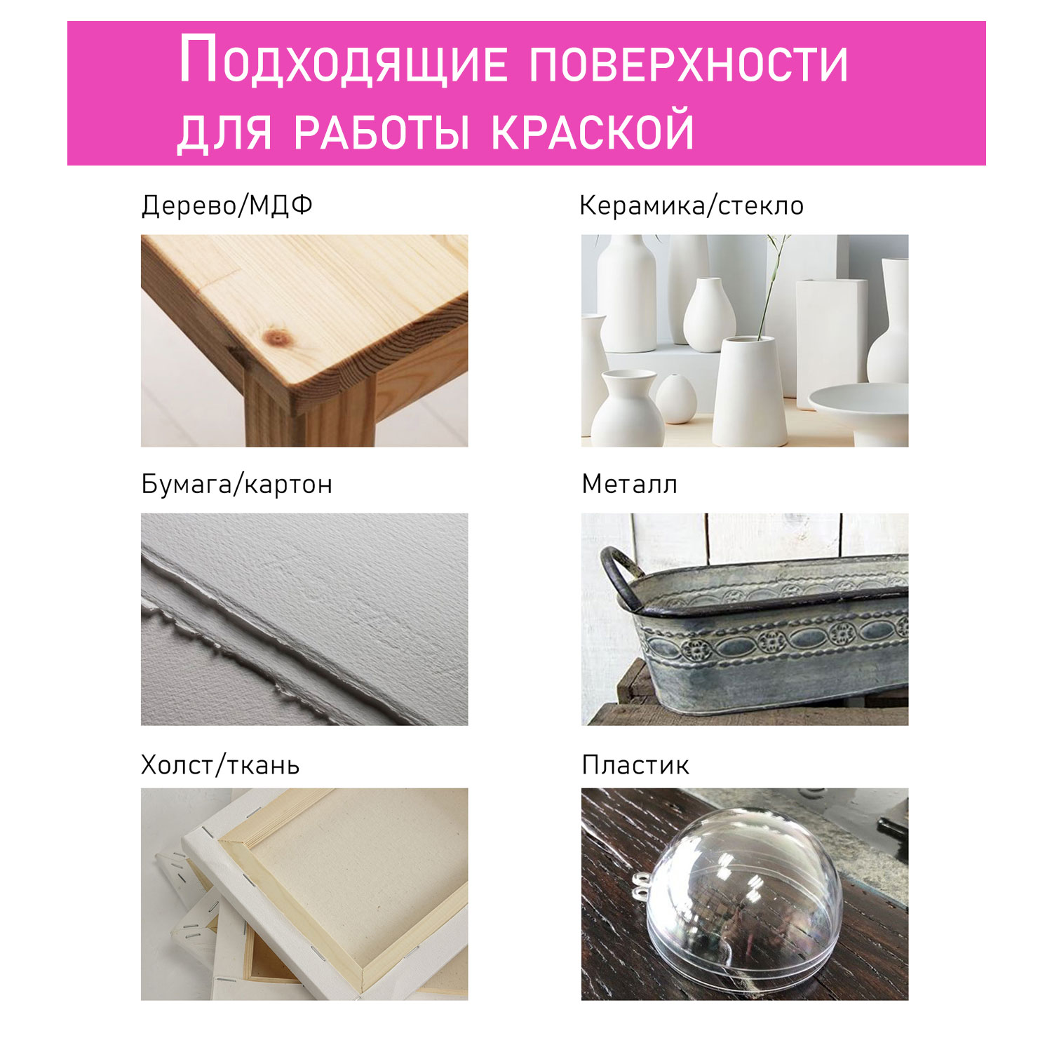 Подходящие поверхности: дерево, фанера, бумага, картон, грунтованный холст, ткани, стекло, грунтованный металл, бетон, кирпич, гипс, природный камень, штукатурка и др.