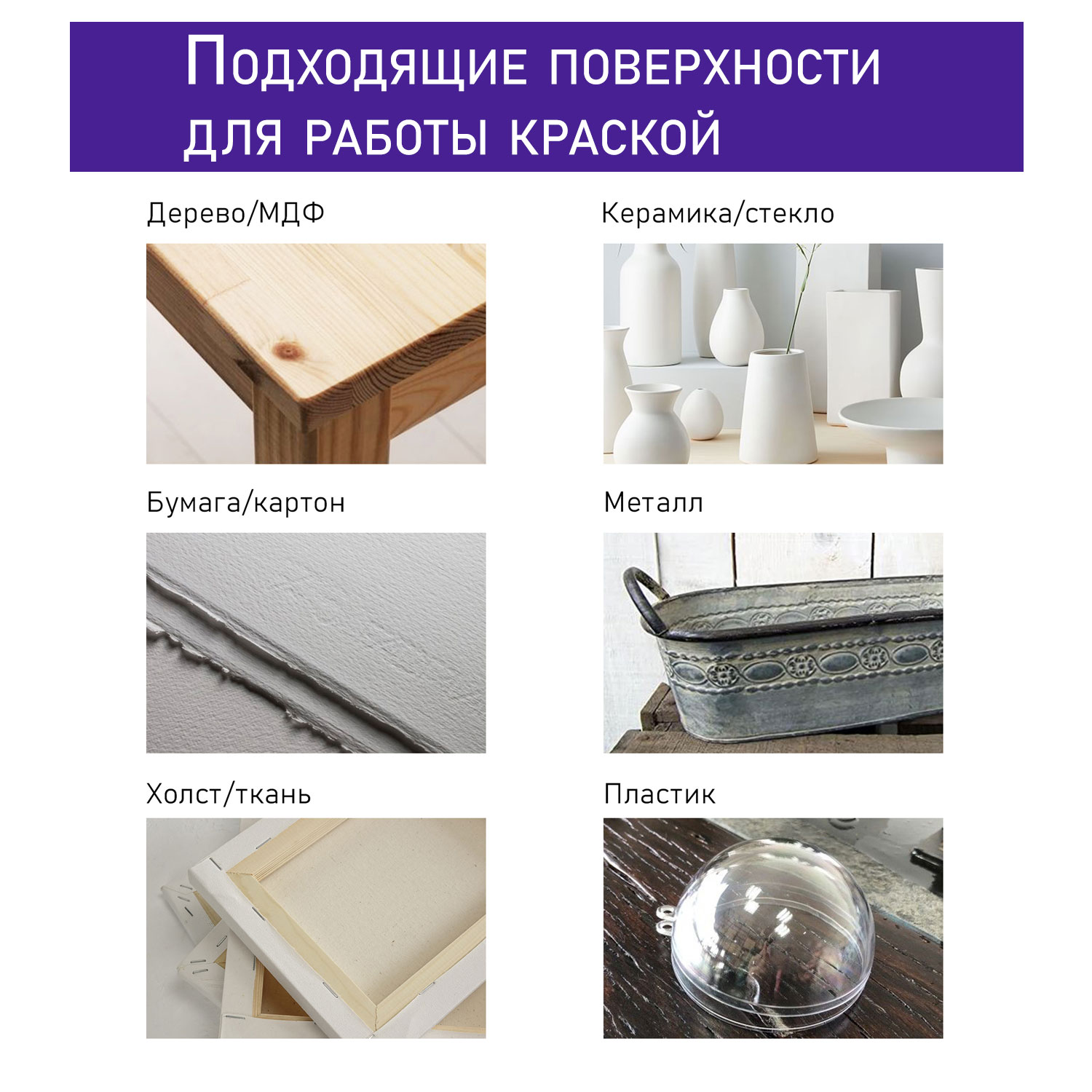 Подходящими для работы подложками являются: дерево, фанера, бумага, картон, грунтованный холст, ткани, стекло, грунтованный металл, бетон, кирпич, гипс, природный камень, штукатурка и др.