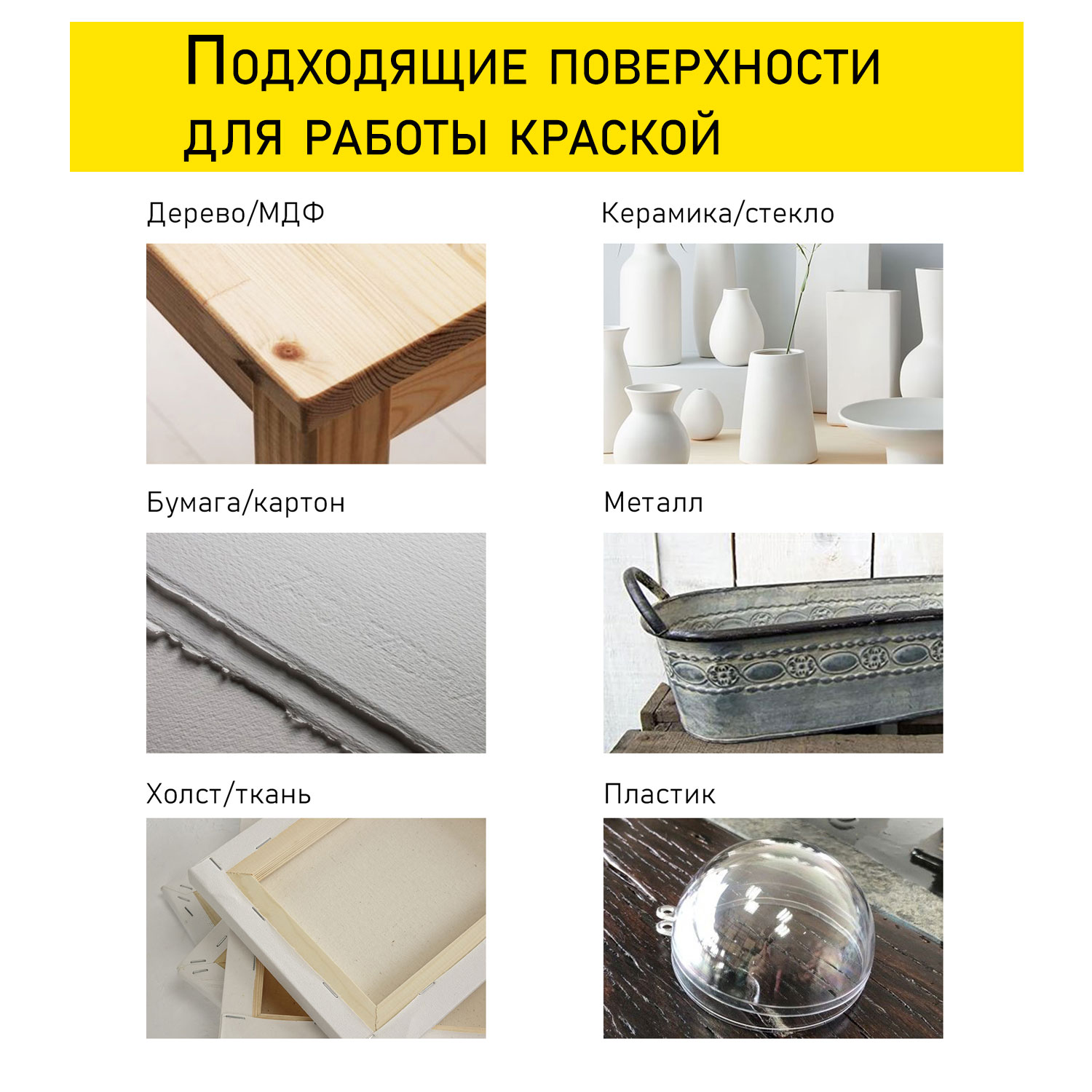 Подходящие поверхности: дерево, фанера, бумага, картон, грунтованный холст, ткани, стекло, грунтованный металл, бетон, кирпич, гипс, природный камень, штукатурка и др.