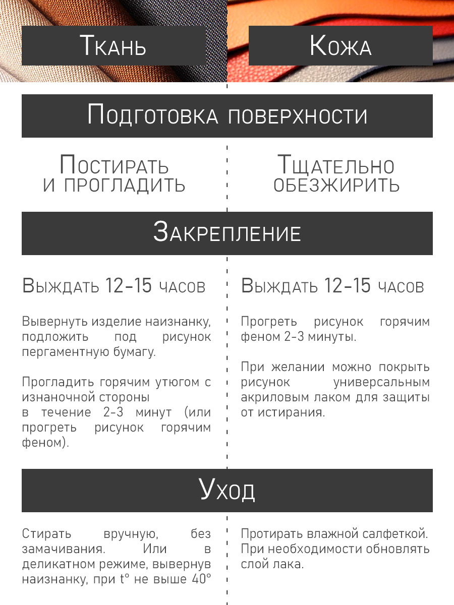Изделия из кожи, кожзама, натуральных и некоторых искусственных тканей. Будьте внимательны, некоторые изделия из искусственной кожи бывают обработаны на производстве составами, входящими в конфликт с красками по ткани и коже (плохая сцепляемость, липкий финиш после высыхания). Рекомендуется предварительная проверка совместимости на небольшом участке.