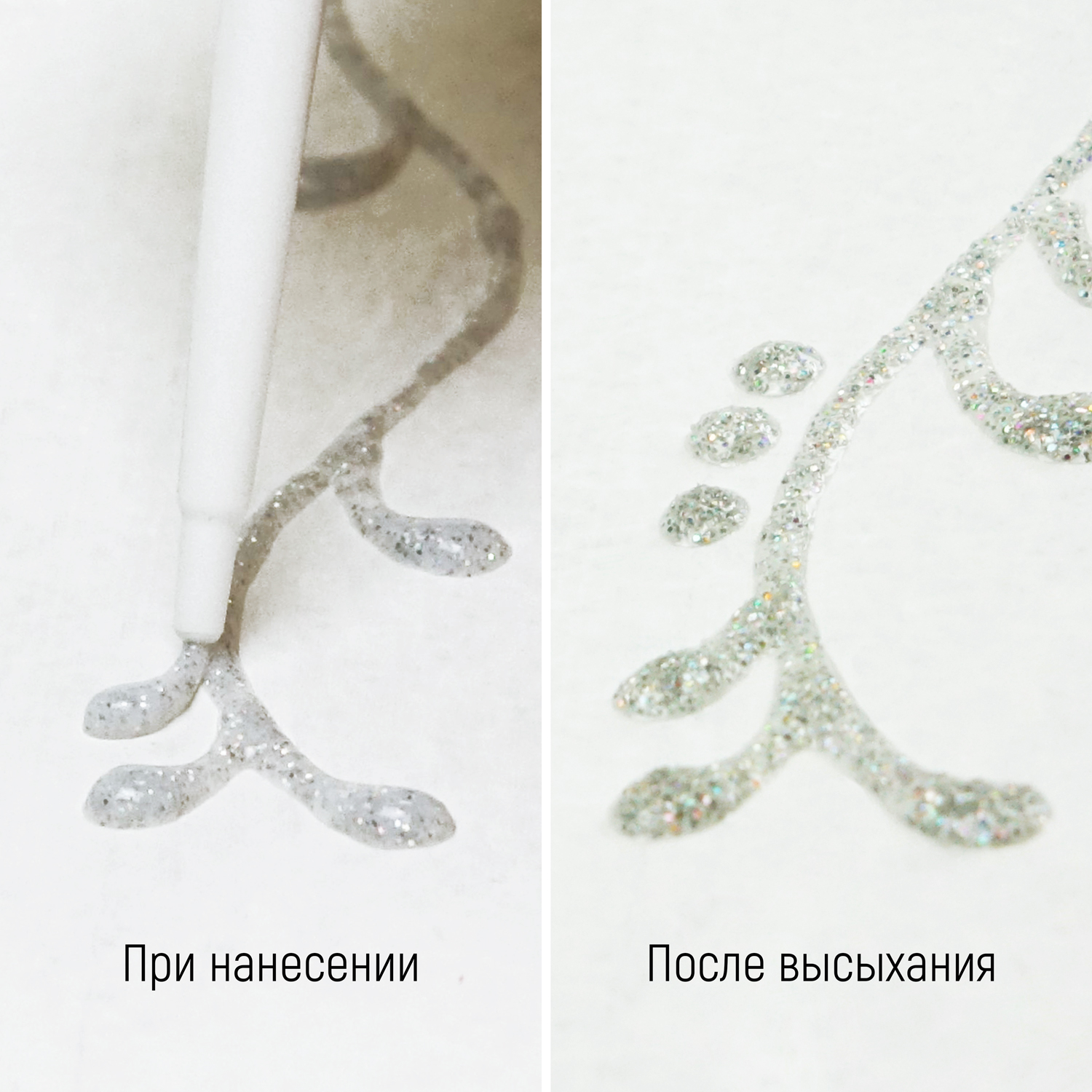При использовании контуров с блёстками на твердых поверхностях после завершения работы необходимо выждать 24 часа. При желании можно закрепить роспись тонким слоем акрилового лака. Однако и без закрепления контуры с блестками показывают хорошие результаты по стойкости.