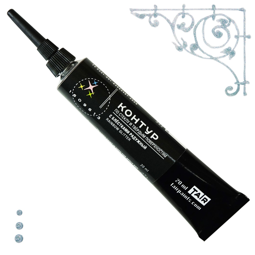 Контуры с блёстками находят применение в декоративно-прикладном искусстве, детском творчестве, в оформлении и украшении поделок, игрушек, всевозможных украшениях и аксессуарах ручной работы. Особой популярностью пользуются контуры с блестками при создании ярких и блестящих элементов в новогоднем и рождественском декоре. Контуры с блёстками ТАИР отличает высокая плотность мерцающих частиц — глиттеров, которые надежно удерживаются в основе после высыхания, не осыпаются и не пачкают руки. С помощью них вы легко создадите чудесный переливающийся контур, цветной или просто наполненный яркими блестками. Хорошая рельефность и блеск сочетаются с гибкостью линии, контур можно использовать даже на тянущихся тканях.