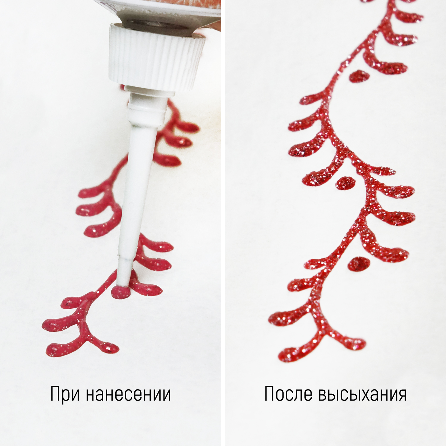Контуры с блёстками находят применение в декоративно-прикладном искусстве, детском творчестве, в оформлении и украшении поделок, игрушек, всевозможных украшениях и аксессуарах ручной работы. Особой популярностью пользуются контуры с блестками при создании ярких и блестящих элементов в новогоднем и рождественском декоре. Контуры с блёстками ТАИР отличает высокая плотность мерцающих частиц — глиттеров, которые надежно удерживаются в основе после высыхания, не осыпаются и не пачкают руки. С помощью них вы легко создадите чудесный переливающийся контур, цветной или просто наполненный яркими блестками. Хорошая рельефность и блеск сочетаются с гибкостью линии, контур можно использовать даже на тянущихся тканях.