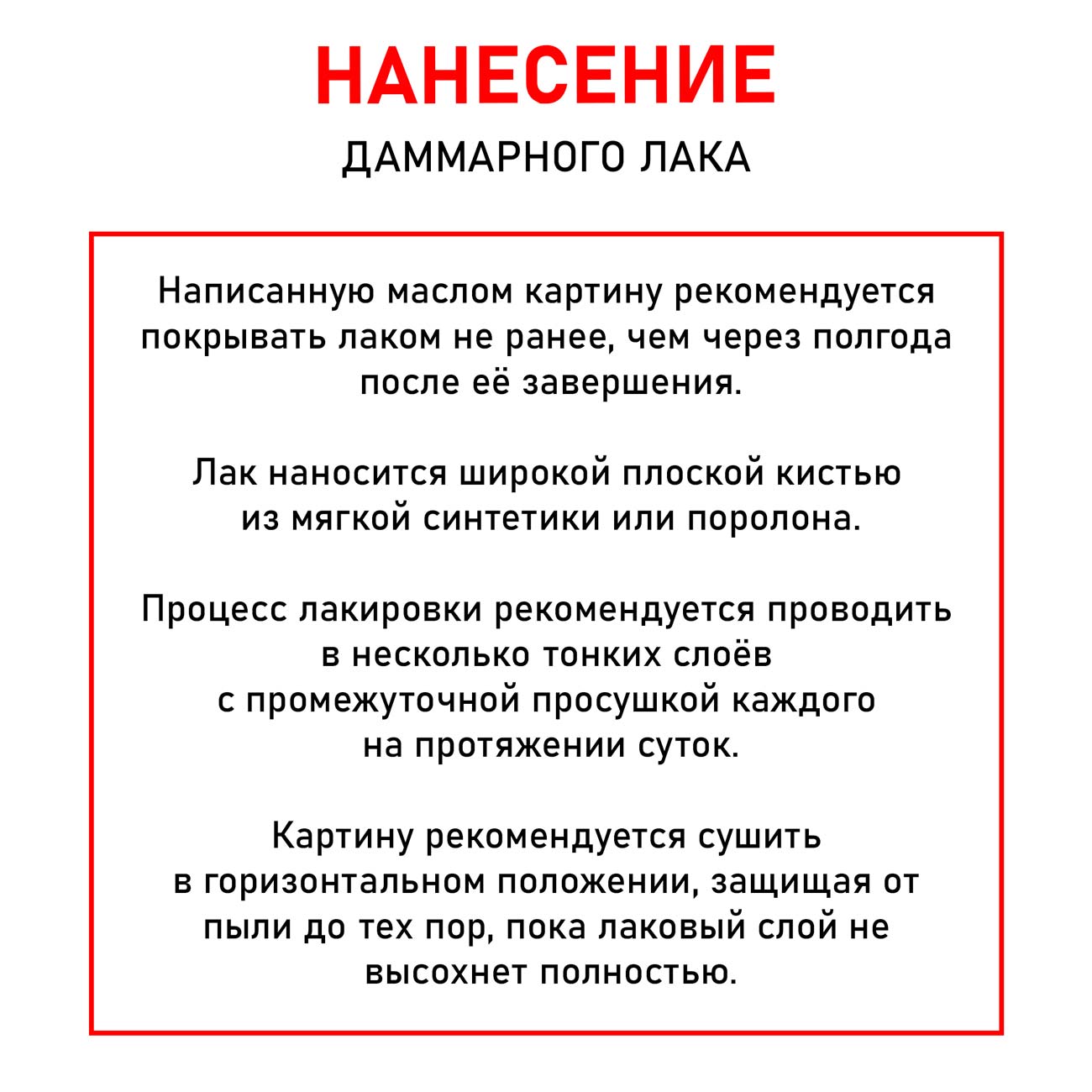 Лак наносится широкой кистью тонким слоем. Защитный лак не стоит наносить толстым слоем, лучше просушить первый слой и повторить лакировку на следующий день. Написанную маслом картину рекомендуется покрывать даммарным лаком не ранее, чем через полгода после её завершения.