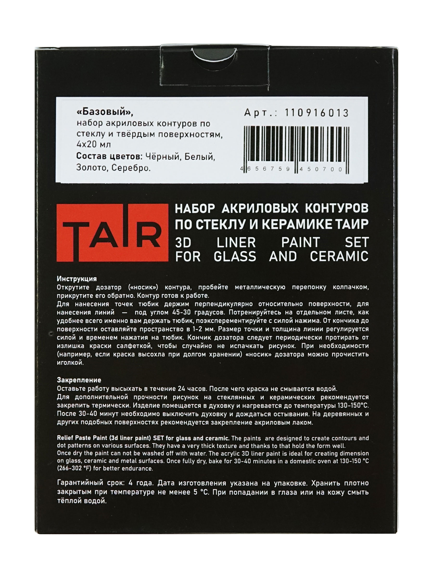 В набор входят акриловые контуры по стеклу и другим твёрдым поверхностям, 20 мл: Чёрный, Белый, Золото, Серебро.