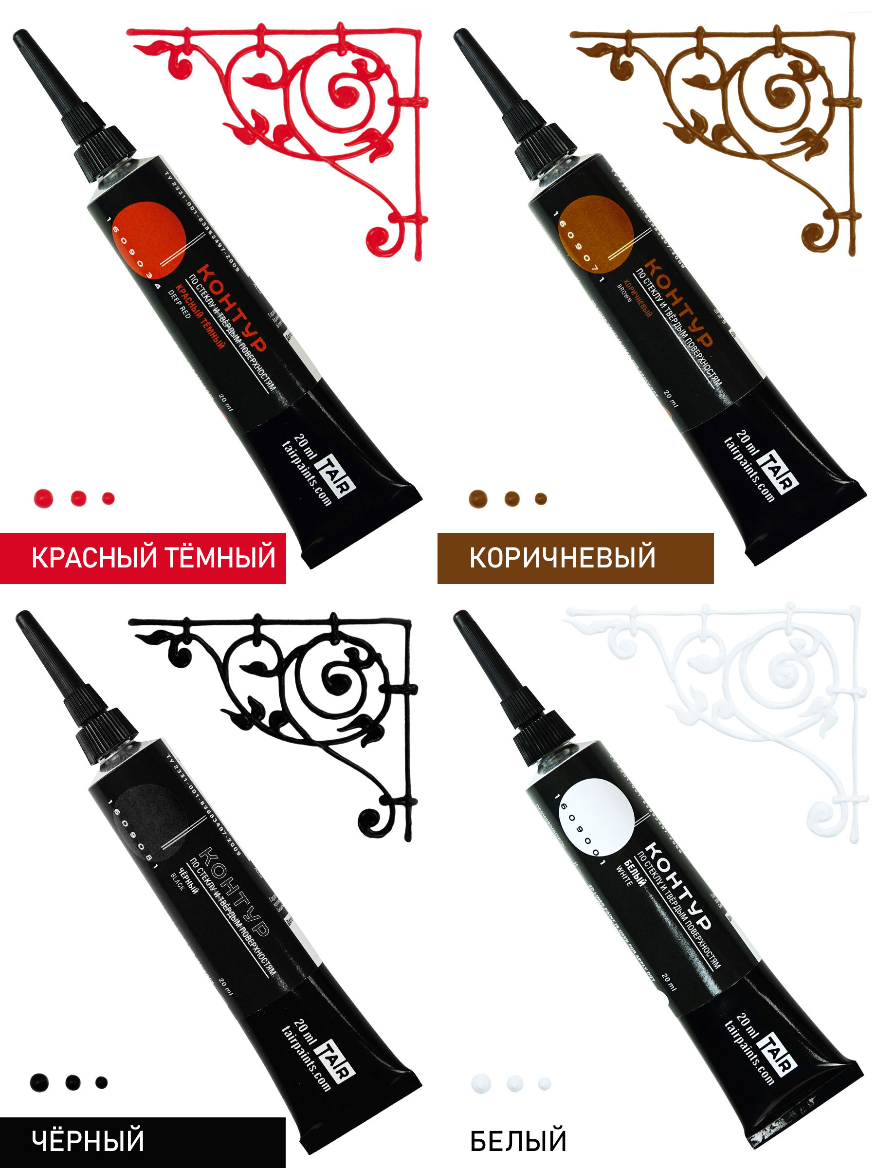 В набор входят акриловые контуры по стеклу и другим твёрдым поверхностям, 20 мл: Чёрный, Белый, Коричневый, Красный тёмный.
