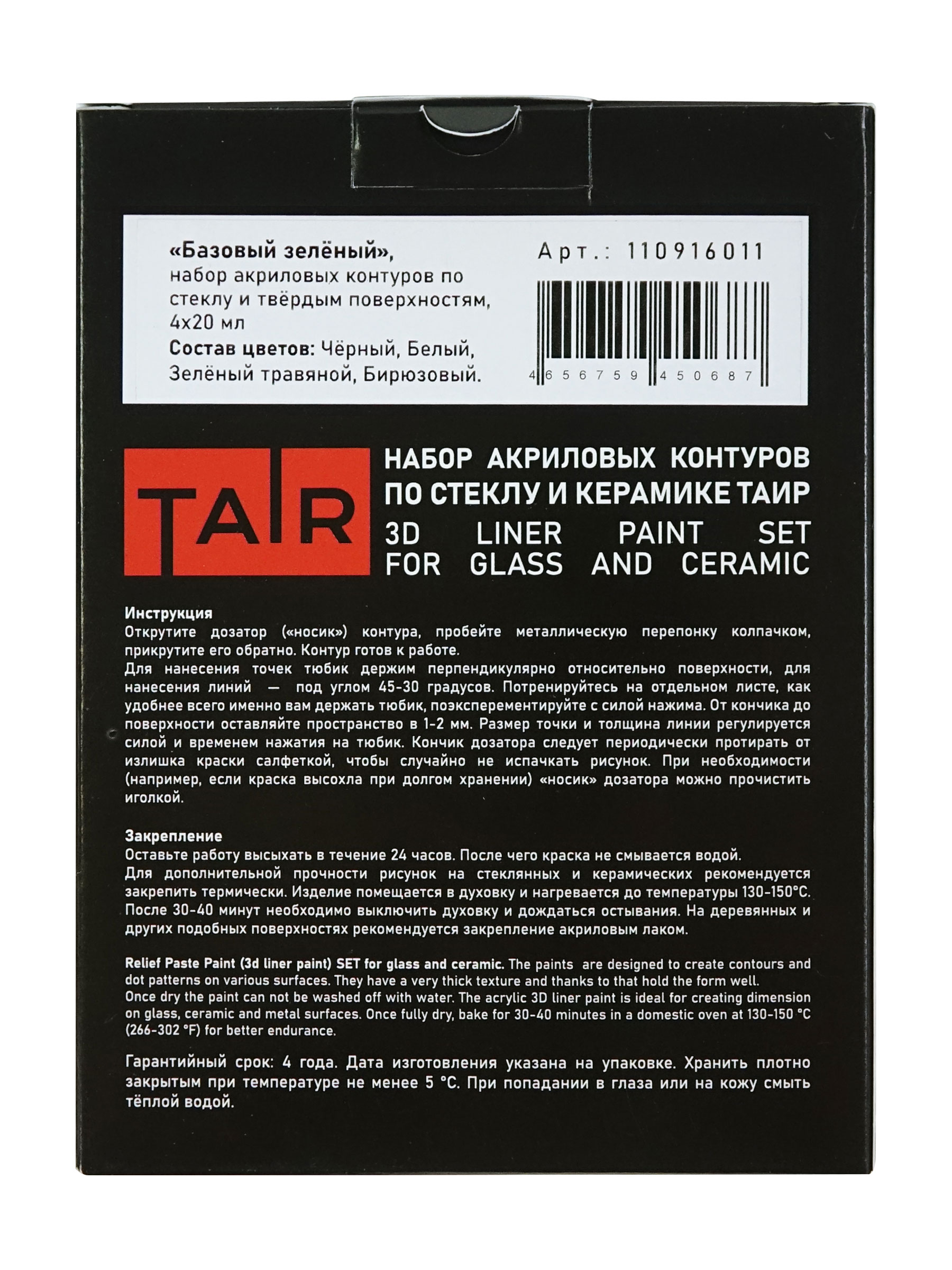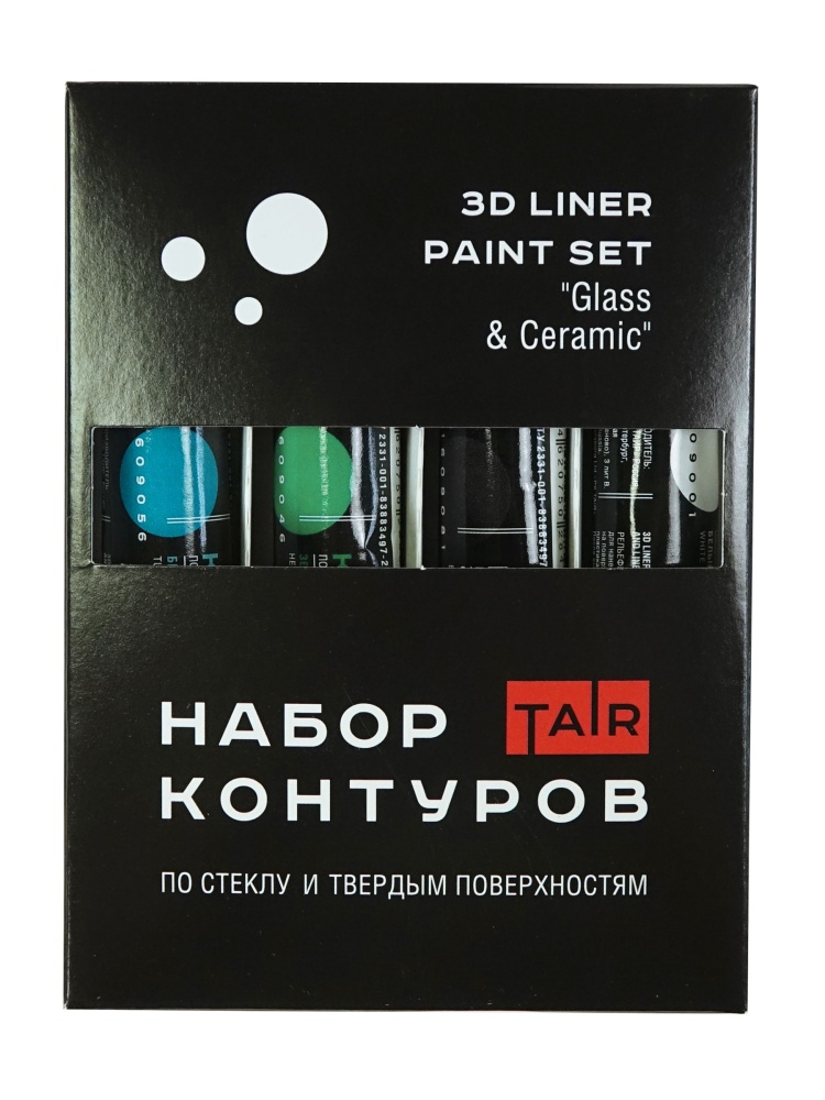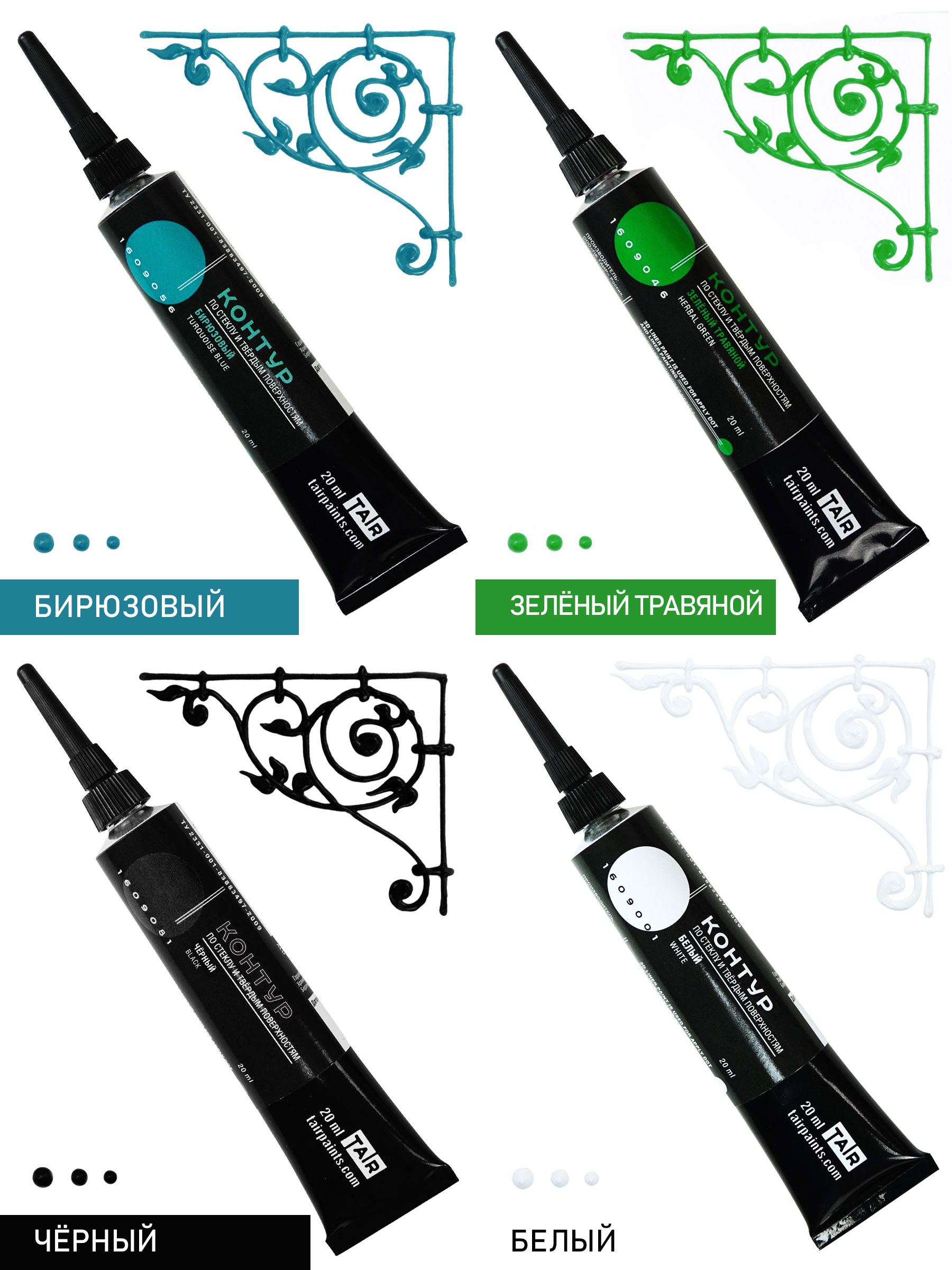 В набор входят акриловые контуры по стеклу и другим твёрдым поверхностям, 20 мл: Чёрный, Белый, Зелёный травяной, Бирюзовый.