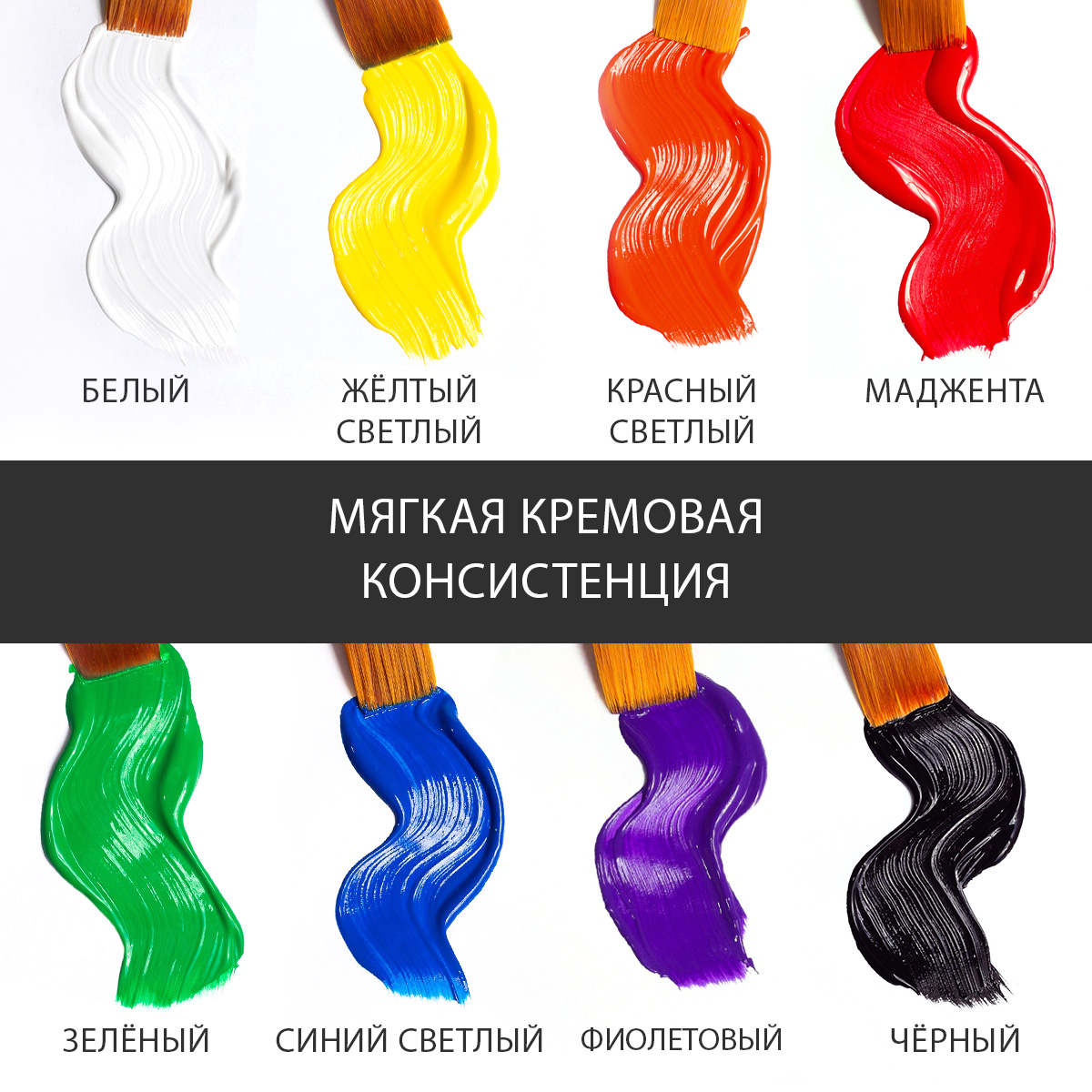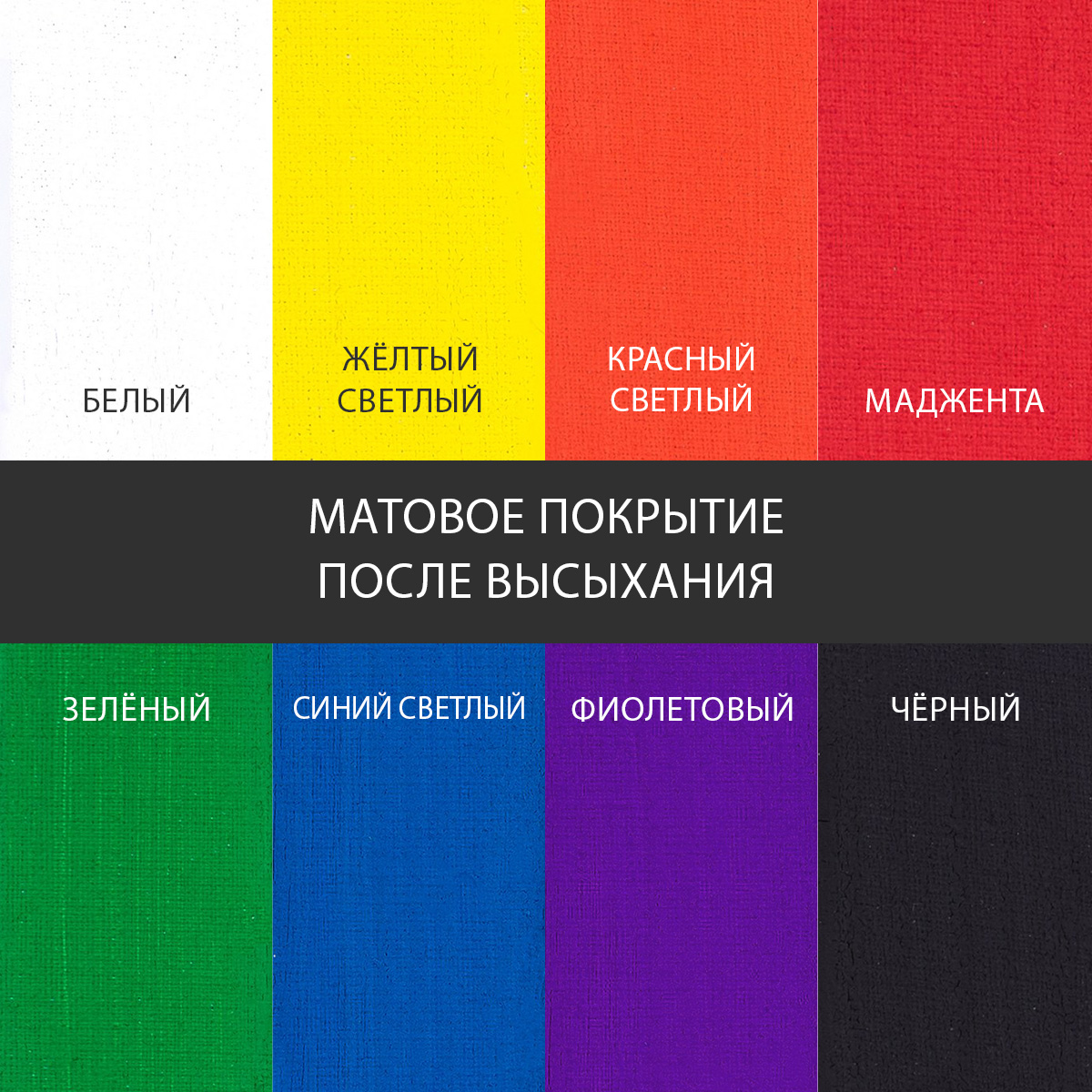 Палитра цветов в наборе (8 цветов по 20 мл): белый, жёлтый светлый, красный светлый, маджента, фиолетовый, синий светлый, зелёный, чёрный.