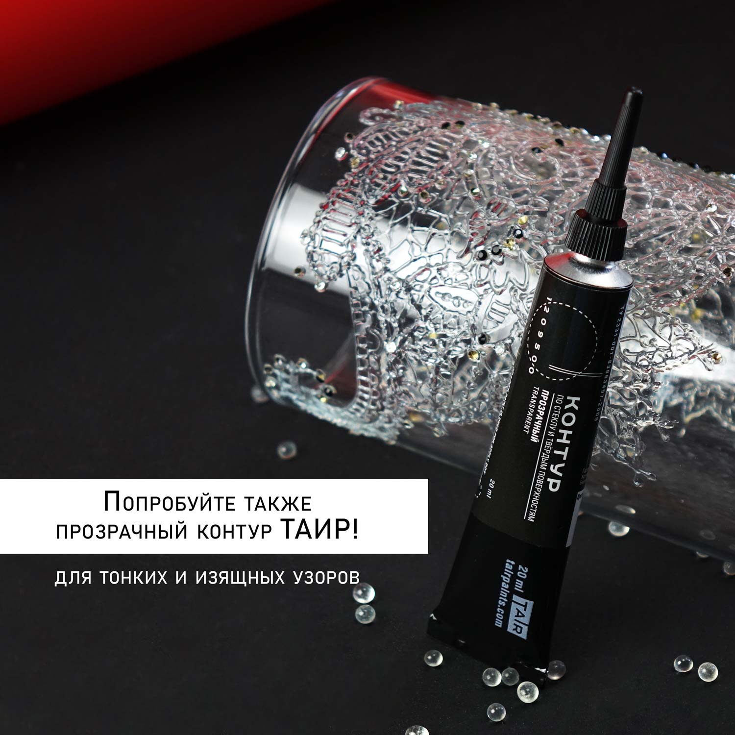 Прозрачный контурный гель при нанесении молочного цвета, но после высыхания становится полностью прозрачным. Он часто используется для создания ледяных капель и узоров в новогодних украшениях, витраже и декоре стеклянных изделий. С его помощью выделяют некоторые элементы рисунка, делая их объёмными и блестящими.